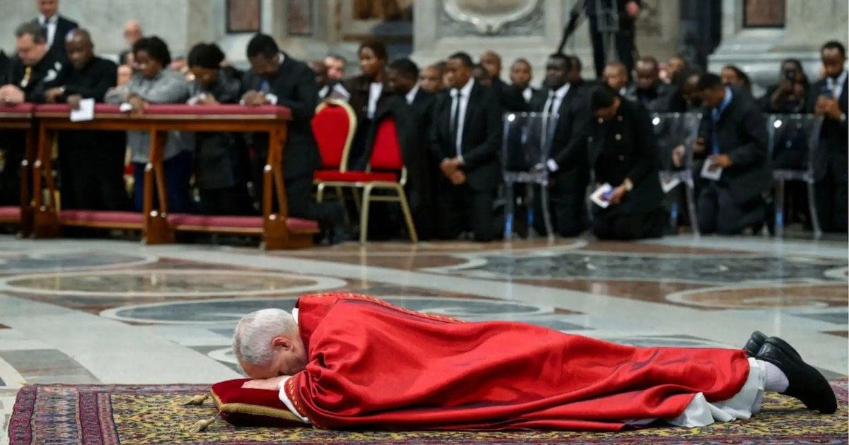 Papa Leão XIV reza deitado no chão do Vaticano durante a celebração da Paixão de Cristo