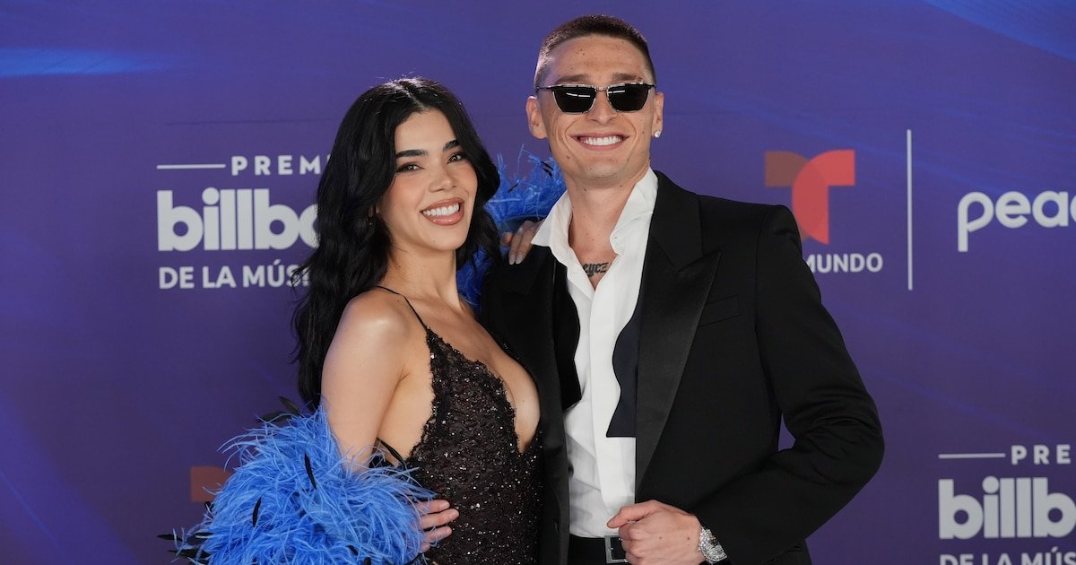 Kenia Os, à esquerda, e Peso Pluma chegam ao Billboard Latin Music Awards na quinta-feira, 23 de outubro de 2025, em Miami. (Foto AP/Marta Lavandier)
