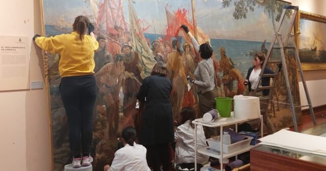A ação, que aconteceu às 14h, gerou preocupação com o andamento da obra José Garnelo Y Aldaque fica na entrada da instituição, que está coberta em grande parte da lateral esquerda com “cor BiodoDradable, como a organização tem apontado nas redes sociais. Apesar disso, há um trabalho no público, embora o grupo mantenha sua mensagem: “A comemoração do 12 de outubro foi a celebração dos séculos, da mineração e do massacre Eles disseram ao povo de Abya Yala”, disseram.