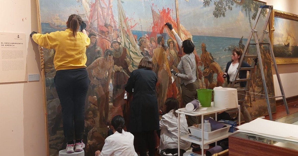 O exército espanhol declarou que a pintura havia sido restaurada O primeiro presente de Cristóvão Colombo, O que foi corrompido neste domingo, 12 de outubro, em protesto ao Dia de Colombo. Ataque, dois ativistas são executados Vegetaispeguei duas cores vermelhas de pintura no centro Museu de Madrid Museu Naval de Madrid.