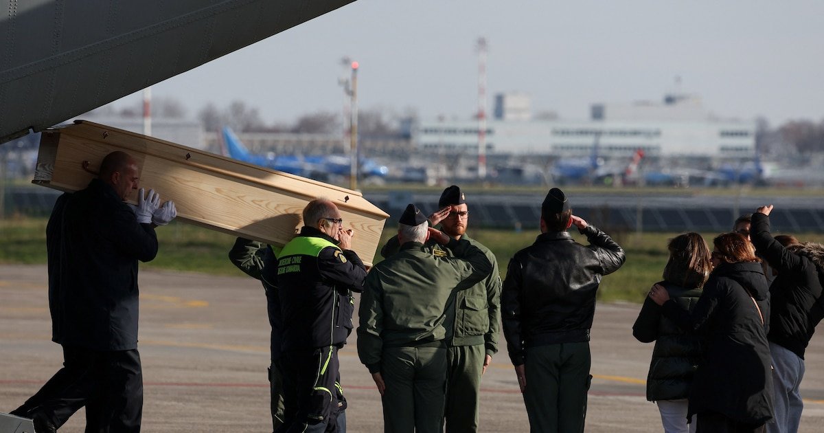 As autoridades ficaram em silêncio enquanto o caixão passava por bombeiros e soldados até um avião de carga C-130 da Força Aérea Italiana. Os enlutados se abraçaram antes de os parentes embarcarem no avião.