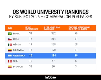 Na edição de 2026 do ranking QS por assunto, ARGENTINA Possui 134 corridas classificadas. Na América Latina são mais do que isso BRASIL (com número de corrida 382), Chile (214), México (188) COLÔMBIA (170).