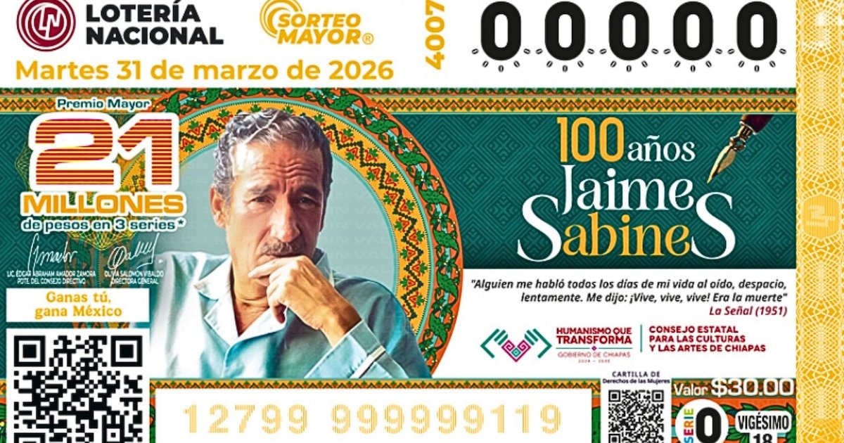 Desta vez, a impressão dos bilhetes de loteria para este sorteio Terça-feira, 31 de março de 2026dar honra “Centenário do nascimento de Jaime Sabines Gutiérrez”, Poeta e político mexicano do famoso Geração de meados do século e referências de revisão de literatura América latina.