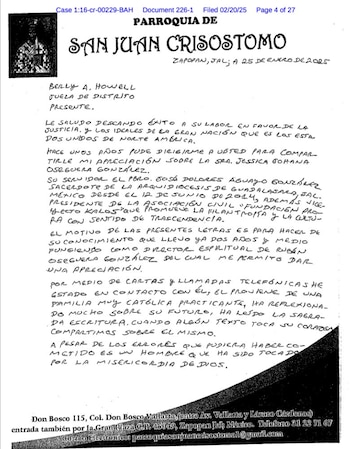 O segundo documento, datado de 25 de janeiro de 2025 e elaborado em papel oficial na Paróquia de San Juan Crisóstomo, seria apresentado novamente ao juiz federal Beryl A. Howell do Tribunal Distrital de Columbia, antes de Oseguera González ser condenado à prisão perpétua mais 30 anosfilho de Nemésio Oseguera Cervantes. As cartas foram publicadas pela jornalista Laura Sánchez Ley, que já falou sobre o assunto e na quinta-feira mostrou em sua conta X.