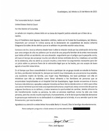 A carta identifica o signatário como sacerdote da Arquidiocese de Guadalajara e vice-presidente da Fundação Projeto Kalós. No artigo, o religioso afirma ter sido diretor espiritual de Rubén Oseguera durante dois anos e meio, mantendo contato por meio de cartas e telefonemas. SIO documento descreve o processo de exame e leitura das Escrituras pelos réusenquanto pedia compreensão e misericórdia durante o julgamento. Não oferece absolvição, mas exige olhar para a transformação espiritual dos condenados.