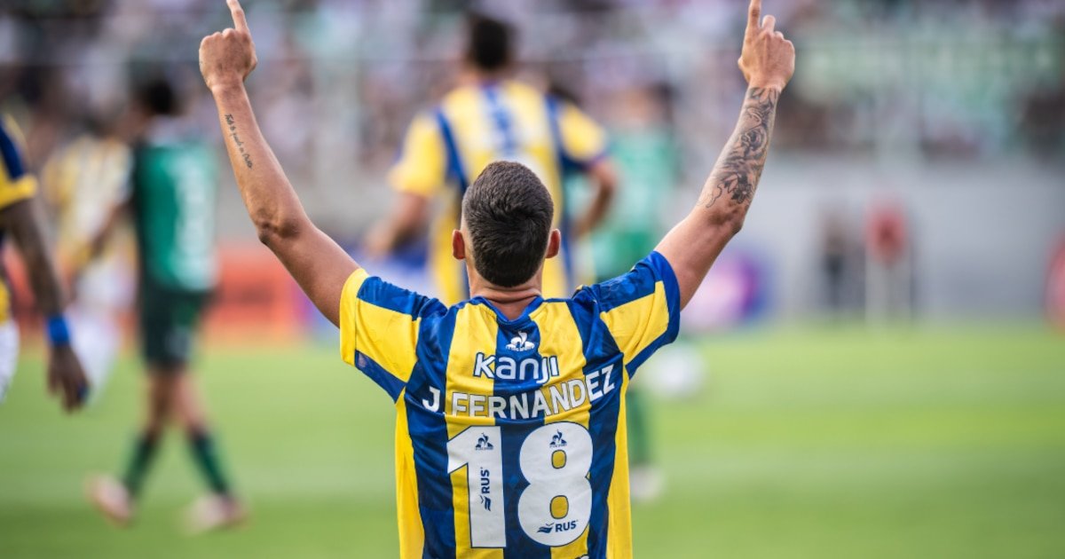 Julián Fernández, com a camisa 18, comemorou o primeiro gol do jogo em Santa Fé erguendo as mãos para o céu. (Relato oficial de Rosario Central no X)