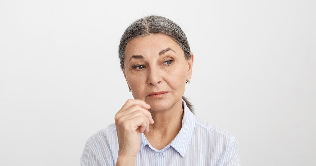 Uma mulher pensativa com cabelos grisalhos reflete. / Escolha grátis