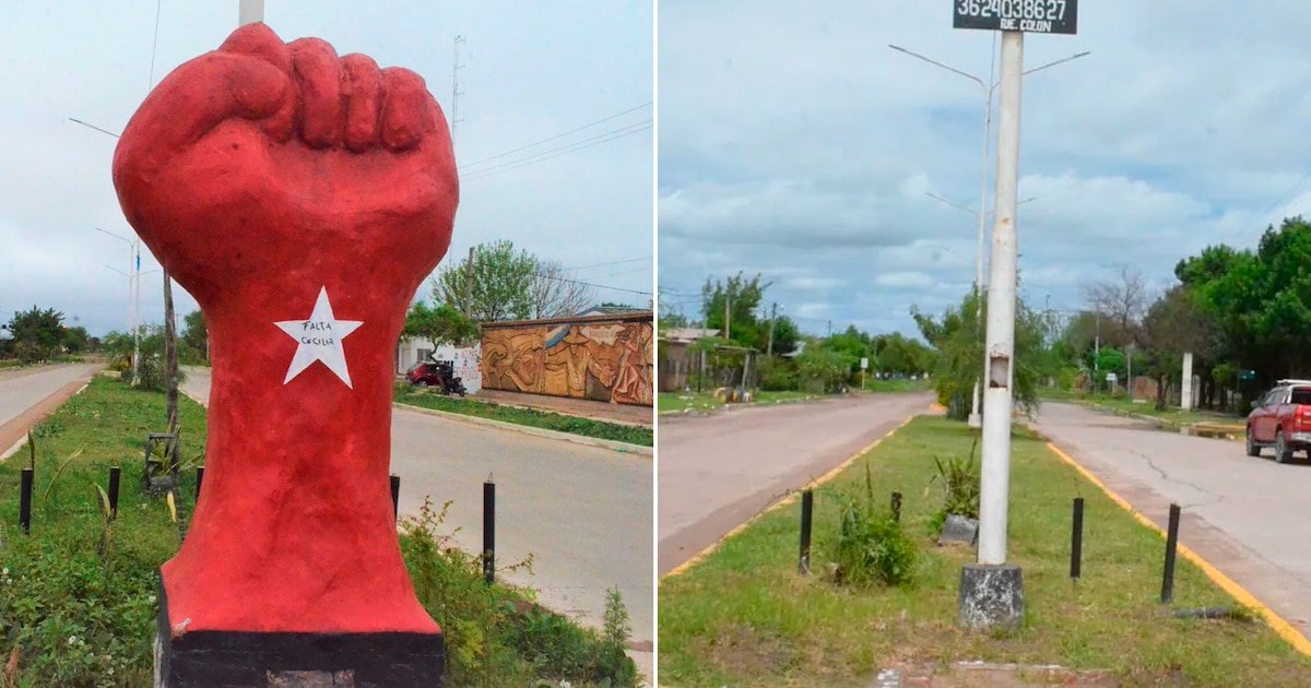 Resistência, chaco (irvoy especial). Até 30 de abril, o acesso à área emerenciano está protegido por uma Muitos punhos vermelhoscom estrela branca no meio: símbolo do movimento fundado pelo líder Piquetero. Hoje, o espaço está vazio. A escultura foi retirada durante operações policiais e em seu lugar está uma laje de concreto cercada por grama alta..