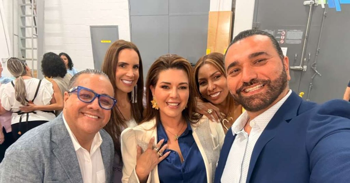 Uma selfie de cinco pessoas sorridentes, incluindo William Meléndez García de óculos, Alicia Machado de blazer creme e Carlos Mesber de barba.