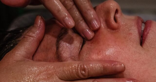 Em seguida, ela limpou meu rosto, aplicou creme de massagem e massageou suavemente meu rosto e a área dos olhos, movendo os cantos externos das solas dos pés, bem como a parte inferior dos ossos e o pescoço. Ele foi claro e firme, mas cuidadoso – quando pressionou os cantos externos dos meus olhos, senti uma tensão nos cantos das minhas bochechas e pescoço.