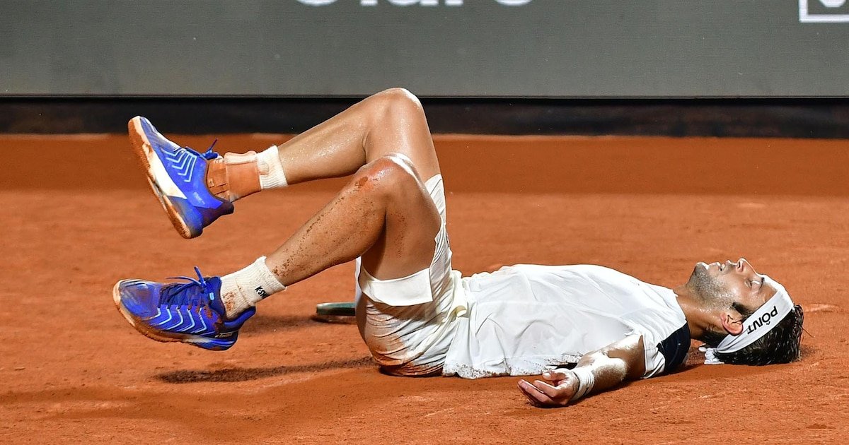 O tenista argentino Tomás Etcheverry comemora seu histórico campeonato do Río Open, exausto e animado, deitado na quadra de saibro após a vitória.