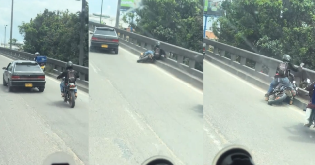 Porém, o sujeito não esperava que o ataque falhasse e acabasse na plataforma e nos trilhos, no que seria a altura de uma ponte, colocando em risco sua integridade física. Para os poucos centímetros, o motociclista não caiu de uma altura maior, o que teria consequências fatais. Felizmente, o homem furioso saiu ileso após o acidente.