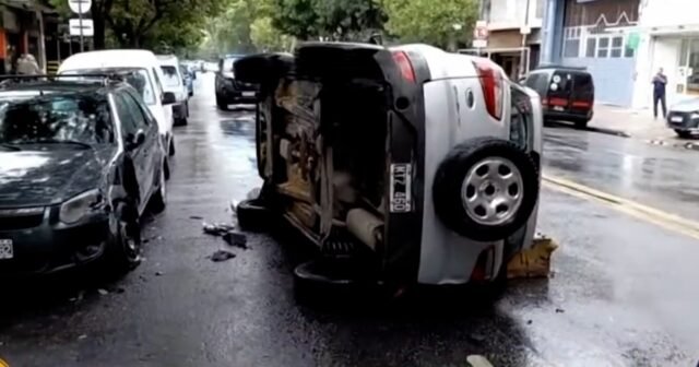 Uma manhã difícil em Buenos Aires: perdeu o controle, bateu em um carro estacionado e capotou no meio da rodovia.