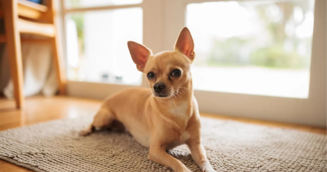 Um cachorro Chihuahua cor de areia clara está sentado confortavelmente em um tapete bege próximo a uma janela bem iluminada de um apartamento, olhando atentamente para os arredores. (Foto: ensaio fotográfico)