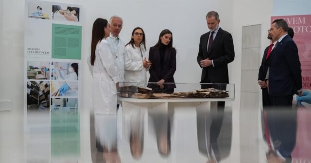 Don Felipe e Doña Letizia visitaram o laboratório da Faculdade de Belas Artes onde a equipe da UPV trabalha desde 4 de novembro de 2024, e puderam conhecer com os coordenadores do projeto – Esther Nebot Díaz, Pilar Soriano Sancho e Pedro Vicente-Mullor – sobre o trabalho desenvolvido durante estes meses.
