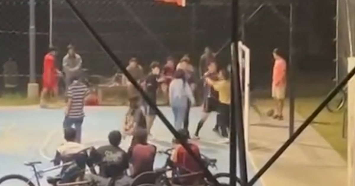 Um grupo de pessoas pode ser visto à noite em uma quadra de basquete, brigando. Várias bicicletas podem ser vistas em primeiro plano