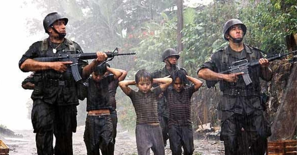 A atriz de Voces Inocentes, Chava, encara o olhar de um soldado em uma cena que retrata o medo e a incerteza da infância durante a guerra civil salvadorenha (foto cortesia de Sensacine).