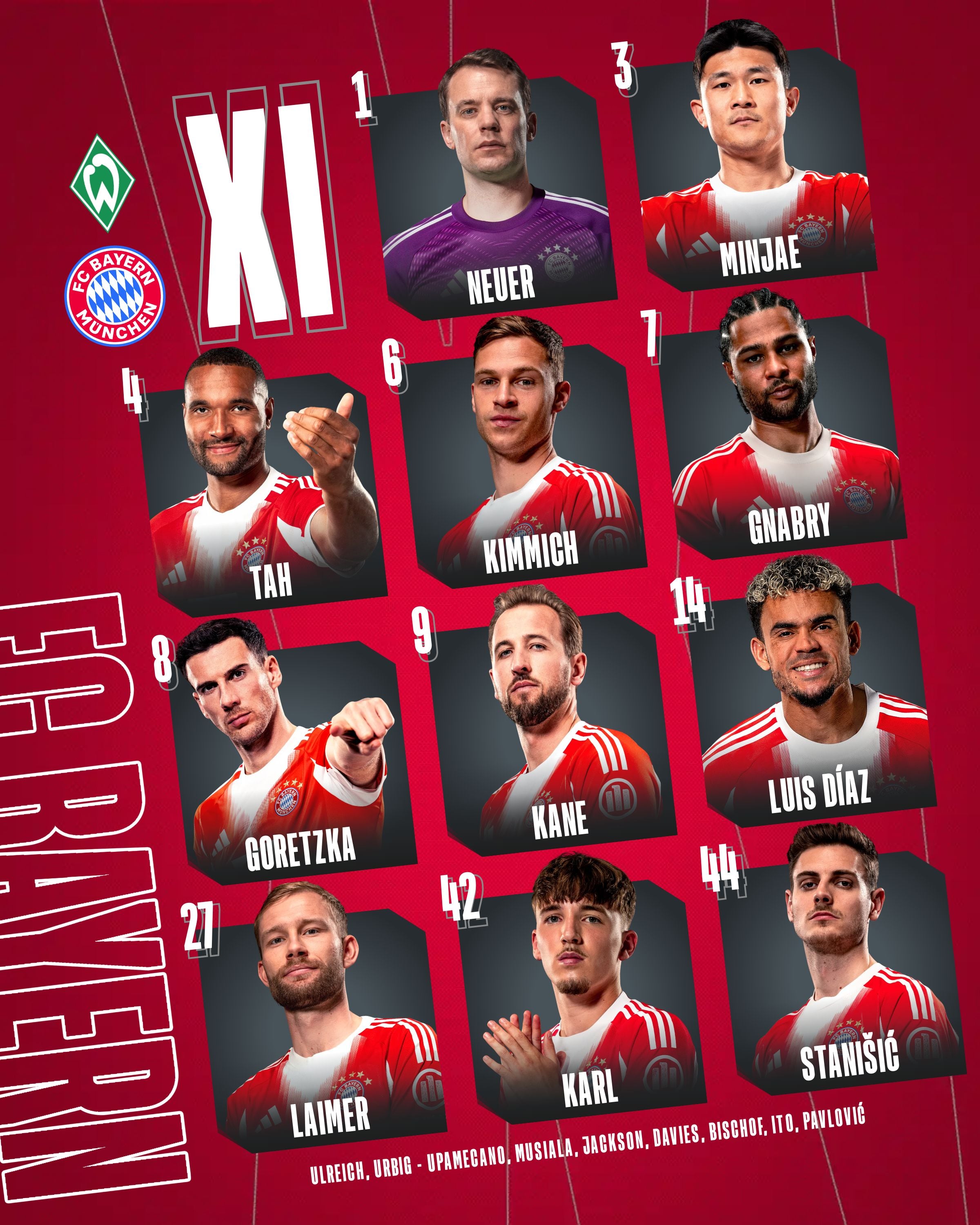- Substituir: Jonas Urbig, Sven Ulreich, Dayot Upamecano, Jamal Musiala, Nicolas Jackson, Alphonso Davies, Tom Bischof, Hiroki Itō, Aleksandar Pavlović